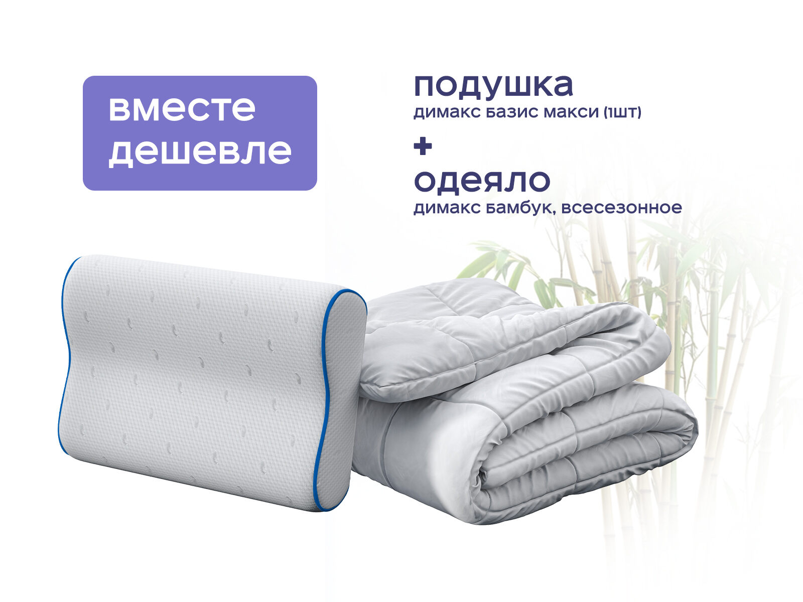 Комплект одеяло Димакс Бамбук всесезонное + подушка Базис Макси 1 шт. Превратите вашу спальню в синтез природных компонентов и передовых технологий. Одеяло с бамбуковым наполнителем создает дышащий микроклимат, а подушка Базис Макси с волнообразной формой подстраивается под каждую линию вашего тела. Это не просто набор для сна — это система, которая заботится о вашем комфорте, здоровье и эстетике. И всё это вы получаете с экономией до 45%, если купите комплект сразу.