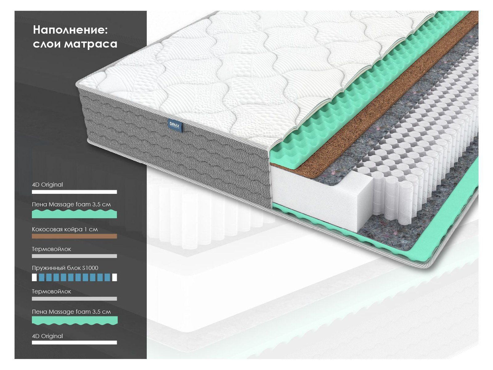 Димакс ОК Релакс С1000 – это двусторонний ортопедический матрас с деликатным массажным эффектом, в котором сочетаются средний и умеренно-жёсткий уровни жёсткости. Благодаря независимому блоку пружин S1000 модель выдерживает нагрузку до 130 кг на спальное место и помогает поддерживать правильное положение спины во время сна.