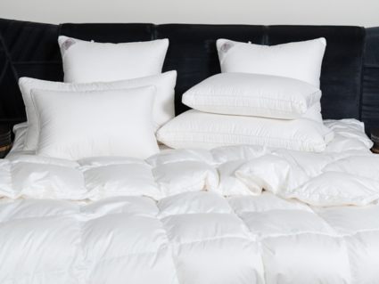 Немецкий хлопковый сатин высочайшей плотности соткан из тончайших нитей (Premium Satin – Nе 200/200 485 ТС) и прошел финишную обработку SanProCare® Sensitive, обеспечивающую усиленную гигроскопичность и придающую ей «пуховую мягкость». Особо тонкий, мягкий и «нешуршащий» чехол обладает повышенной износостойкостью и предотвращает проникновение пылевых клещей внутрь изделий. Наполнителем служит пух высочайшего качества, отобранный на гусиных фермах Сибири, которая, по утверждению биологов, является зоной проживания гусей, носящих пух максимально больших размеров, что, безусловно, влияет на пуховую массу положительно и наполнитель имеет повышенный коэффициент упругости (Fill Power), достигающий значений в 850 ед.