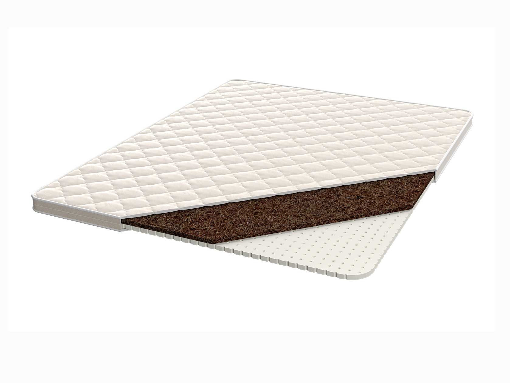 Разносторонний наматрасник Кокосовая койра 2 см + Латекс 2 см служит для усиления ортопедического эффекта основного матраса и позволяет сделать спальное место более комфортным, меняя стороны в зависимости от предпочтений (высокая или низкая жёсткость). Кокосовая койра – гипоаллергенный, упругий и устойчивый к гниению и деформации материал. Кокос служит гигиенической защитой спального места, поддерживает сухость внутри и препятствует появлению неприятных запахов. Мягкий и эластичный натуральный латекс отличается повышенной упругостью, устойчивостью к воздействиям внешней среды, термостабильностью (зимой на нём спать не холодно, летом-не жарко).
