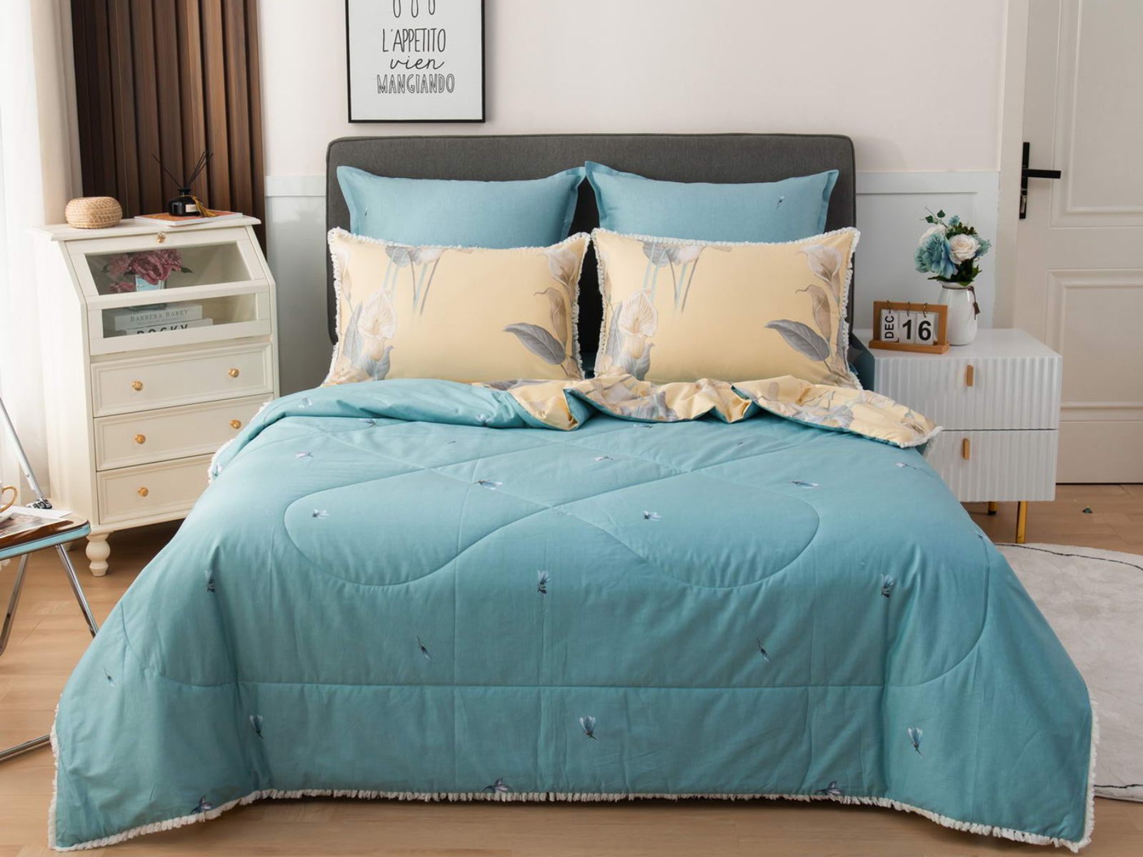 В комплекты комфортеров с одеялом Бернадетт входят наволочки, простыня и легкое всесезонное одеяло. Оцените это современное и очень удобное решение, которое идеально подходит тем, кто не любит возиться с пододеяльниками.