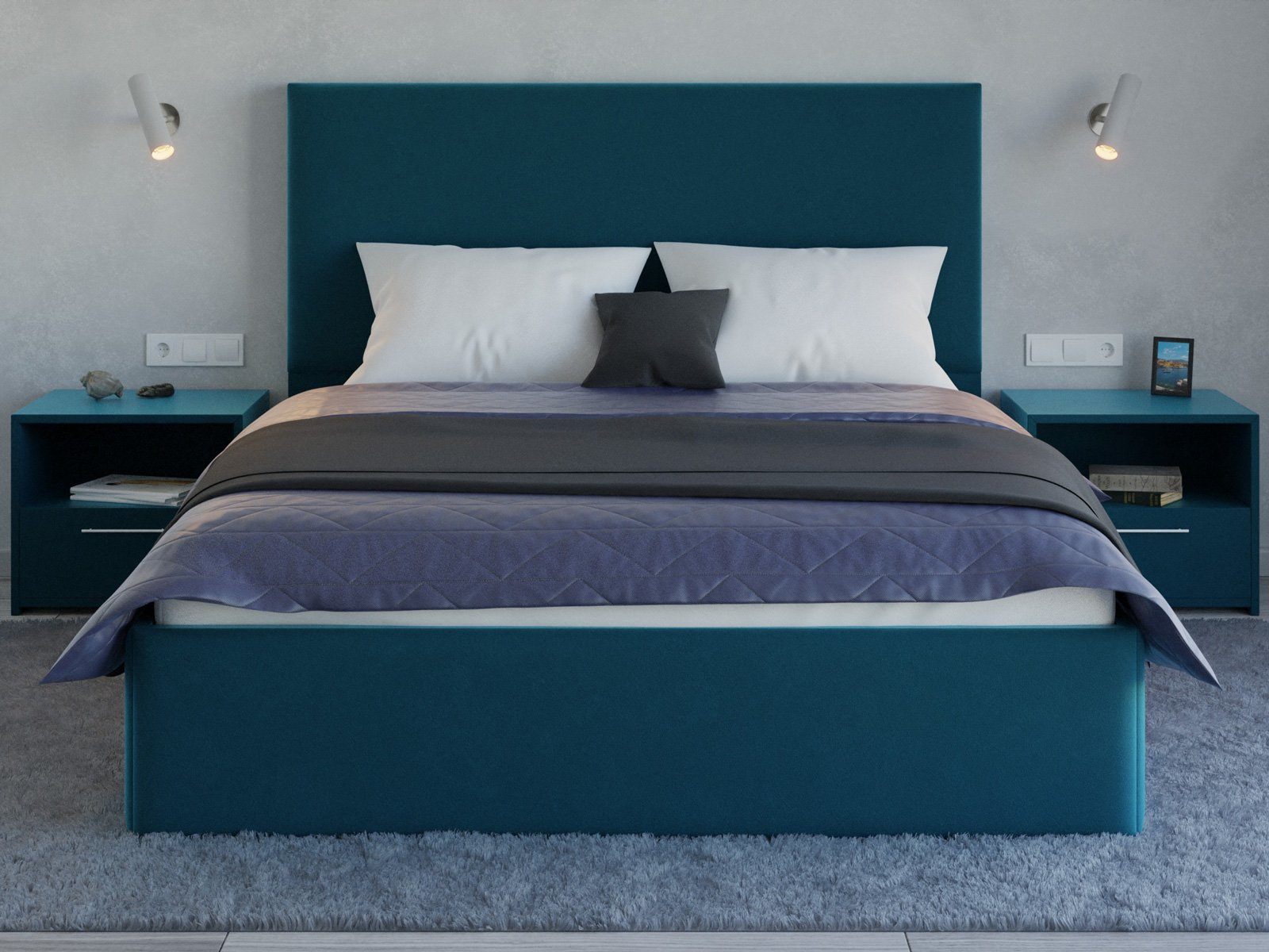 Мягкая кровать с обивкой из велюра.