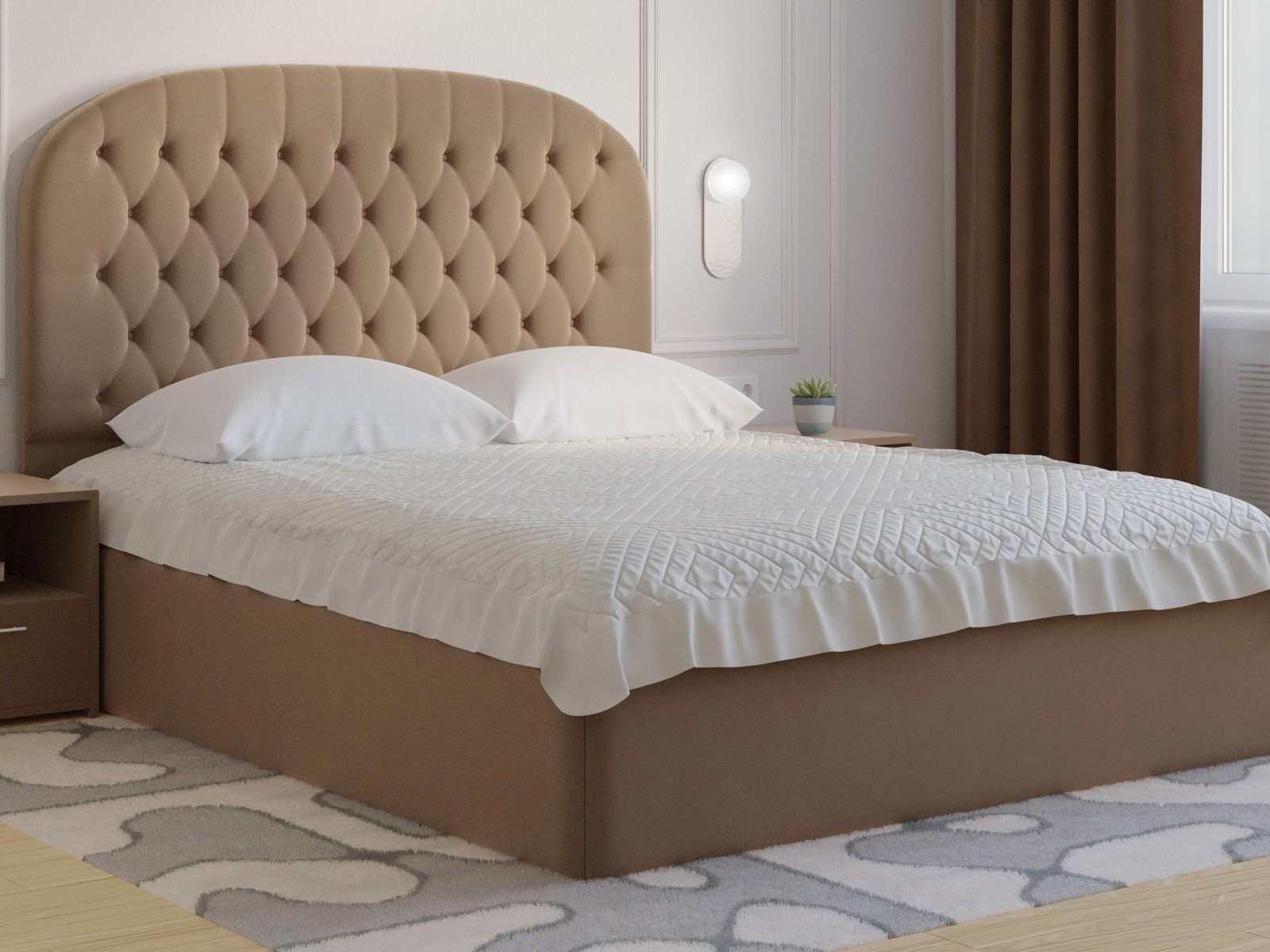 Мягкая кровать с обивкой из велюра.