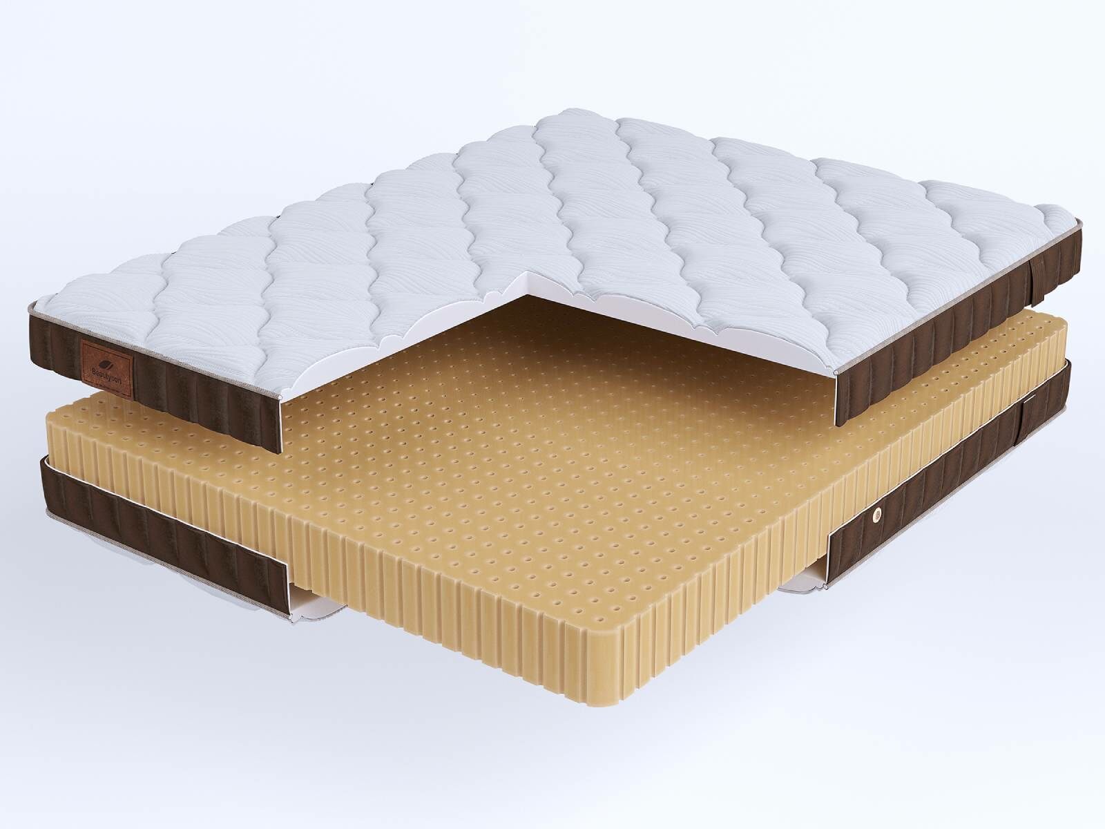 Хлопковая трикотажная ткань чехла обеспечивает комфорт и обладает отличной воздухопроницаемостью. Высокообъемная стежка с использованием холлофайбера (600гр.) подарит дополнительный комфорт спальному месту. Изысканный бурлет из мягкого велюра красивого бежевого цвета придает матрасу роскошный внешний вид и подчеркивает его премиальный статус. Каждая модель серии LIFE украшена фирменной кожаной биркой BeautySon, подтверждающая исключительность каждого матраса.