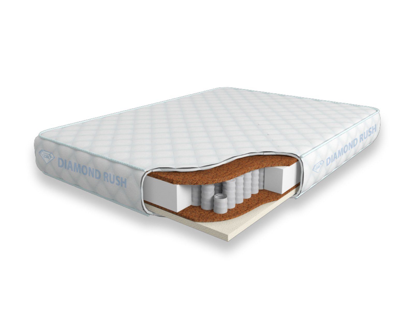 Матрас Diamond Rush Mix Cocos-2 725SD имеет в своей основе независимый пружинный блок 725, состоящий из пружин диаметром 5-6 см. С одной стороны в качестве настила на пружинный блок используется средне-жесткое сочетание искусственного латекса и тонкого слоя кокосовой койры. С другой стороны идет упруго-жесткая кокосовая плита 2 см.