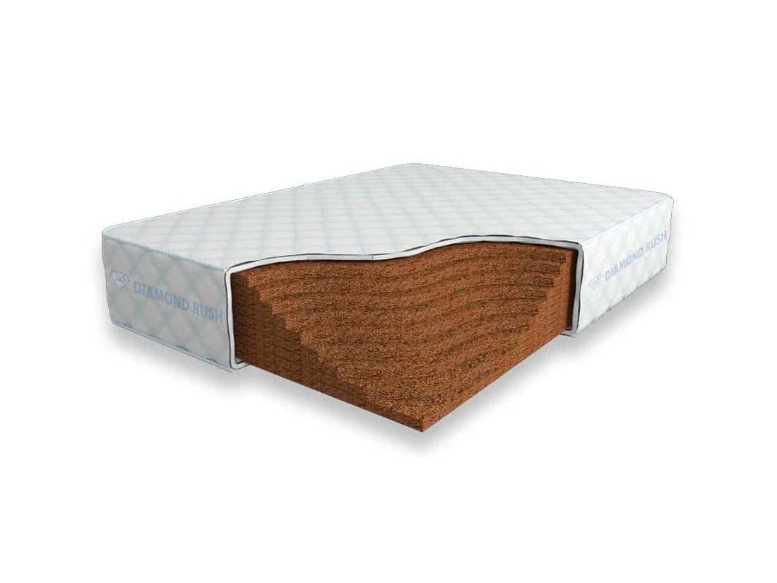 Матрас Diamond Rush Solid Cocos 27 DR является беспружинным, т.е. не имеет в своей основе пружинного блока. В его состав входят один или несколько слоев латексированной кокосовой койры. Это один из самых жестких материалов. Матрас, выполненный целиком из кокосовой койры, в меньшей степени обладает анатомическим эффектом.