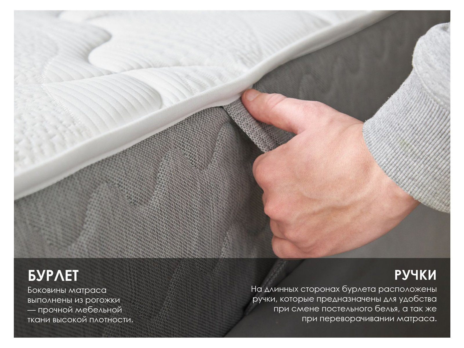 Чехол модели шьётся из светлого, но прочного трикотажа. Красивая износостойкая ткань придаёт изделию нарядный внешний вид. Трикотаж простёгивается на синтепоне и пене Balance высокой плотности. В результате обивка обретает мягкость и приятный рельеф. Для фиксации и надёжной службы установлен слой спанбонда. Все вместе слои формируют 4D Original – четырёхслойную обивку повышенного комфорта. Чехол несъемный и оснащён боковыми ручками.