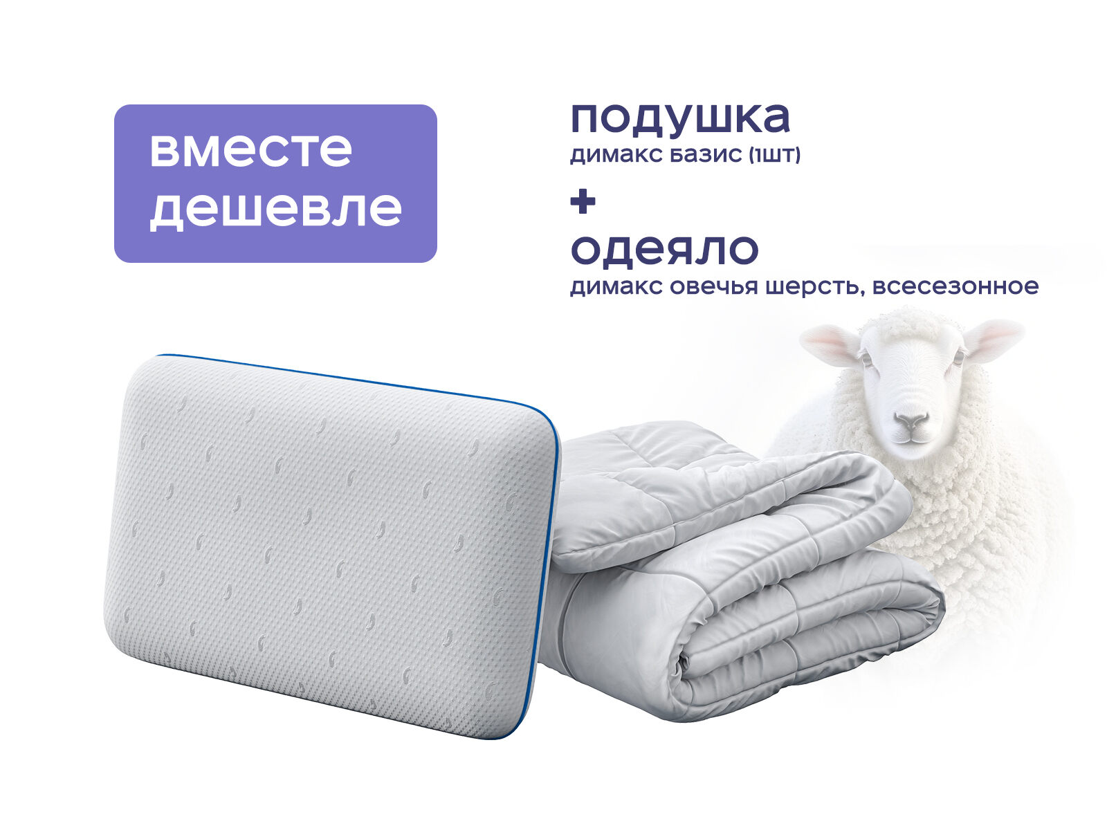 Комплект одеяло Димакс Овечья шерсть всесезонное + подушка Димакс Базис 1 шт. Набор, где естественное тепло встречается с технологией поддержки. Мечтаете о сне, который напоминает уютный плед в горном шале, но при этом заботитесь о здоровье? Этот комплект объединяет силу природы и точность инноваций. Одеяло из овечьей шерсти дарит дышащее тепло, а подушка Базис с пеной мемори подстраивается под вашу анатомию. И всё это — с экономией до 43%, если вы выберете товары набором.