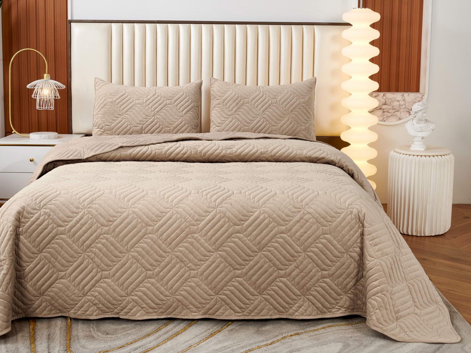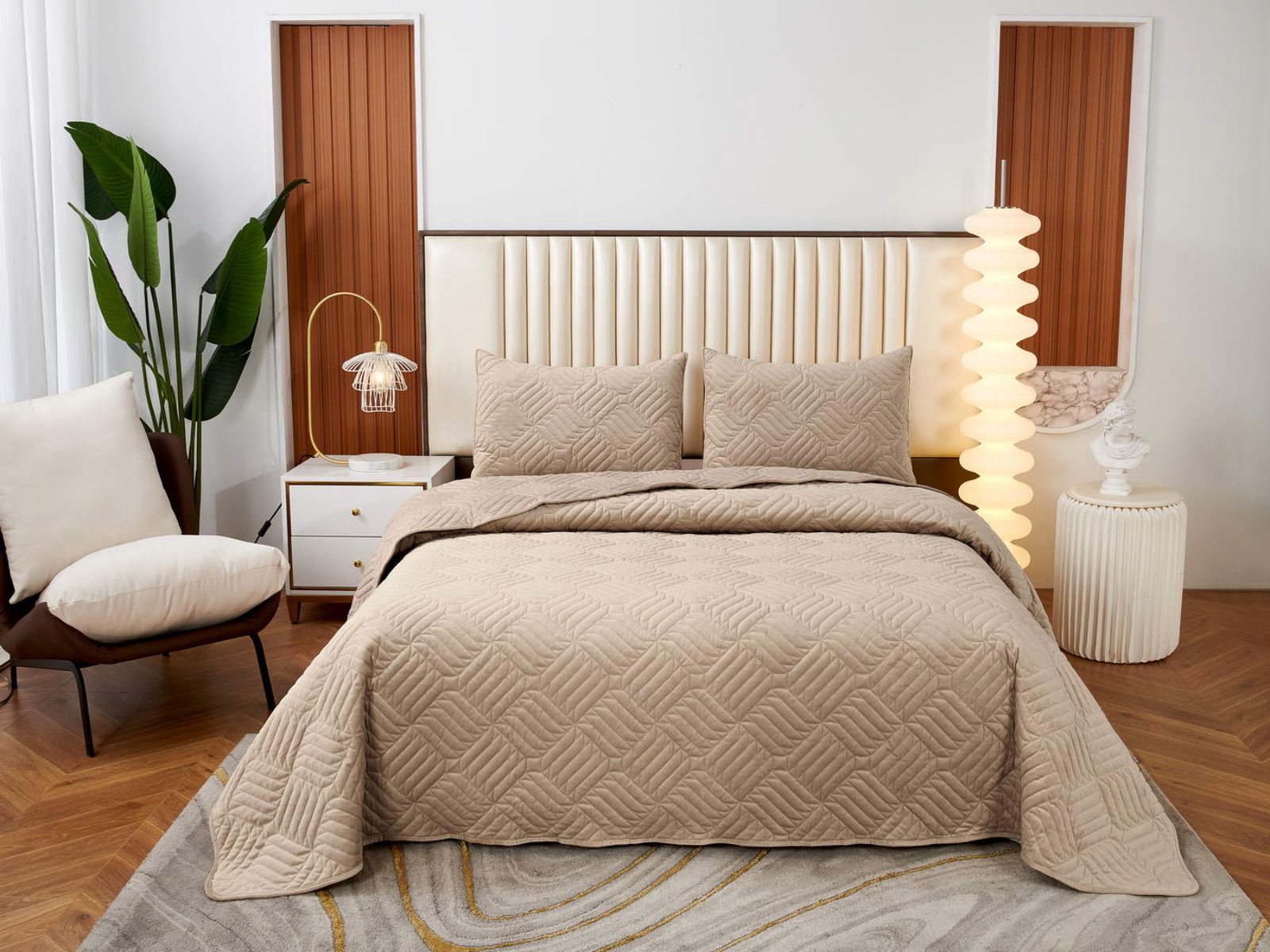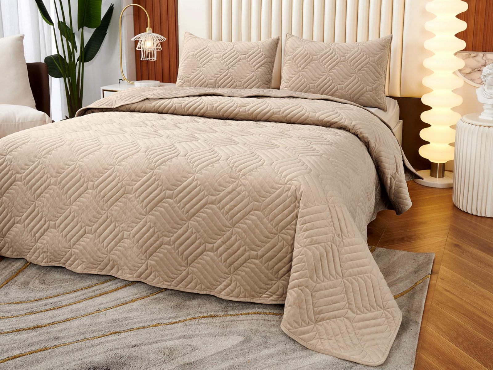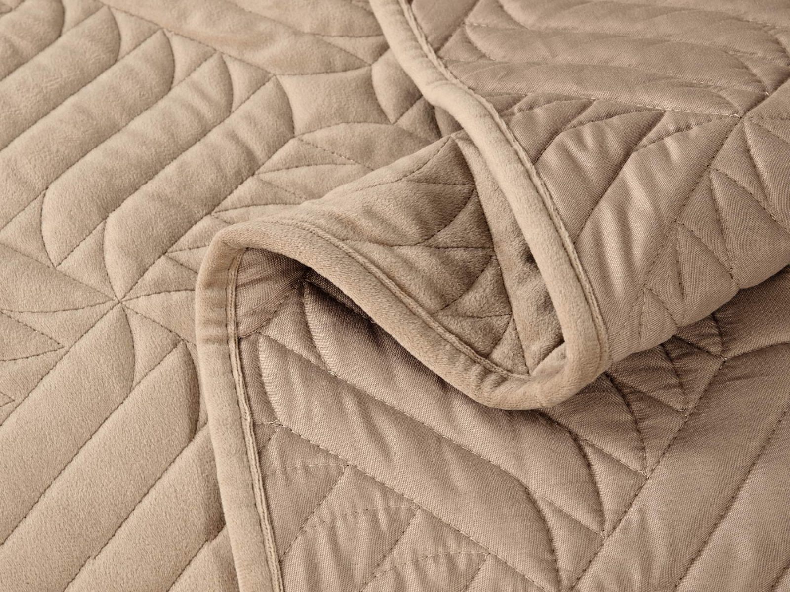 Покрывала выполнены в 10 оттенках: крем, мокко, пепельный, песочный, светло-бежевый, светло-серый, серый, темно-серый, чайная роза и черный. Стежка в виде геометрического орнамента подойдет к любому современному интерьеру. Из-за особого плетения, велюровая ткань покрывала отражает свет и красиво переливается при различном освещении.