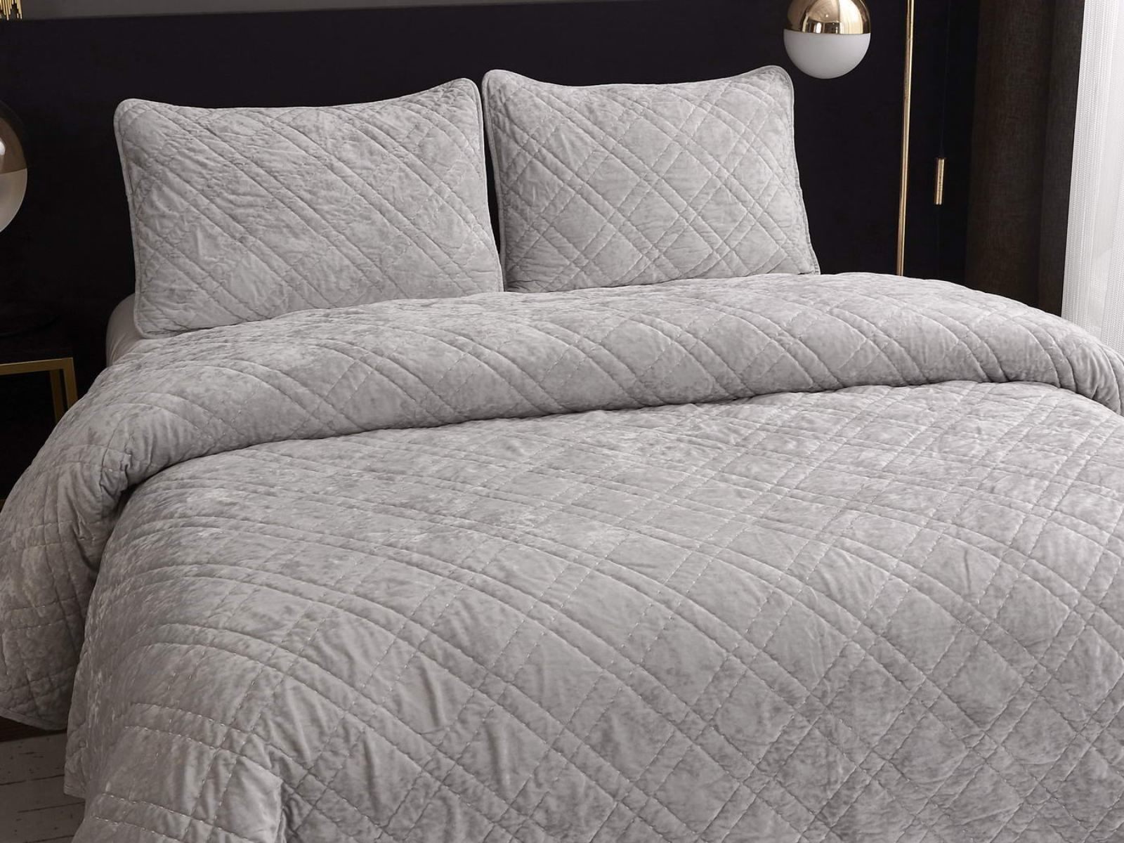 Покрывало Селена выполнено в девяти оттенках: пудра, антрацит, беж, изумруд, капучино, пепел роза, серебро, стоун, терракот. Они подойдут практически для любого интерьера, от классического, до модерна или романтического. Стеганое бархатное покрывало будет необыкновенно смотреться на вашей постели. В комплект входят покрывало и одна либо две наволочки (50х70 см) из аналогичного материала в зависимости от размера.